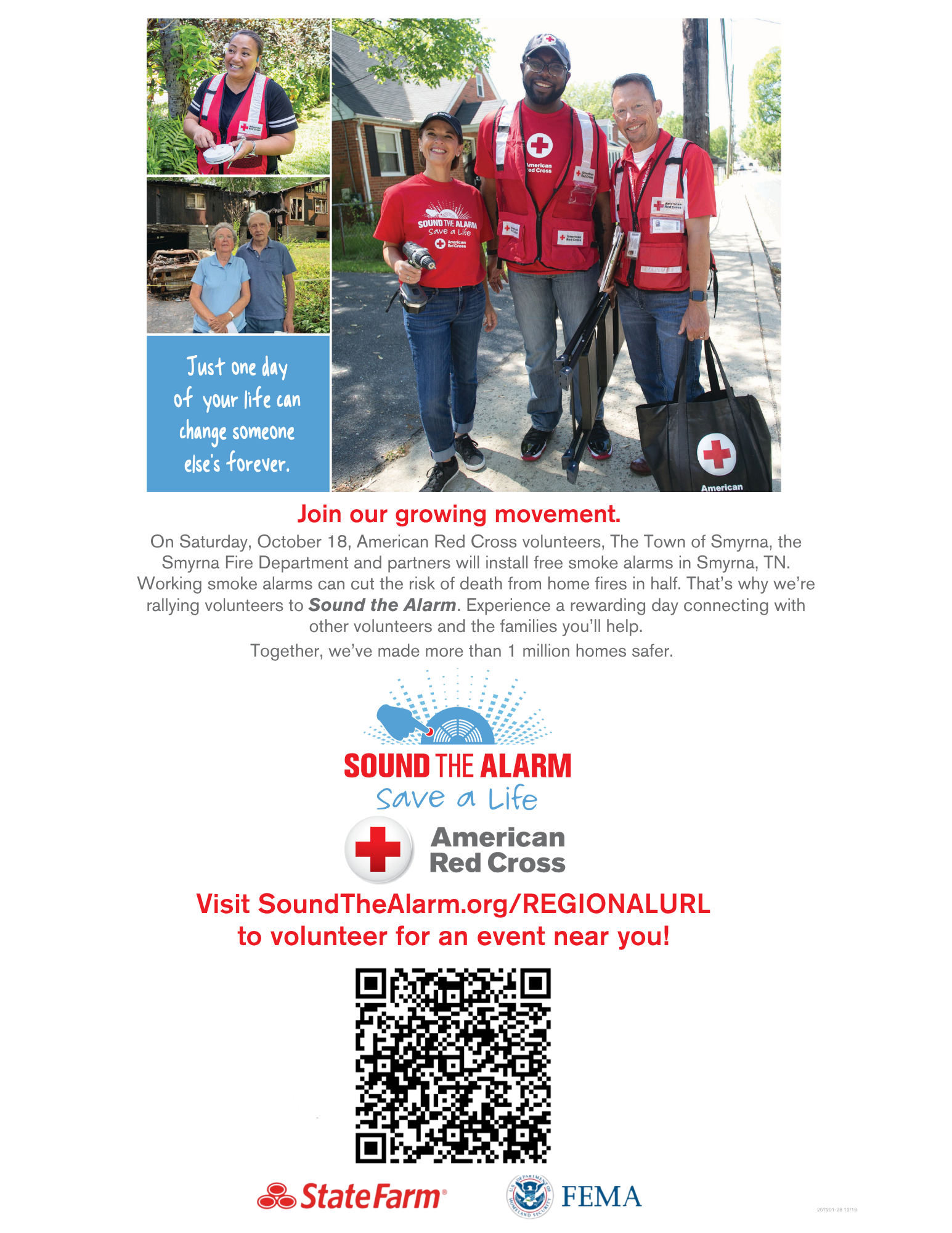 On Saturday, October 18, American Red Cross volunteers, The Town of Smyrna, the Smyrna Fire Department and partners will install free smoke alarms in Smyrna, TN. Working smoke alarms can cut the risk of death from home fires in half. That’s why we’re rallying volunteers to Sound the Alarm. Experience a rewarding day connecting with other volunteers and the families you’ll help.